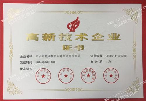 乾潤精密鋼球喜獲國家高新技術(shù)企業(yè)榮譽(yù)稱號
